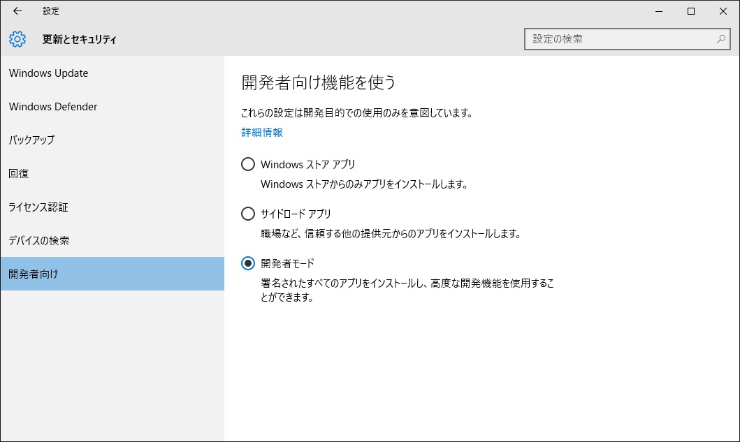 To follow the instructions listed at Enable your device for development in Development Center, please select Developer mode from a dialog of Visual Studio or SETTINGS of Windows 10. (Go to Startup Menu of Widows 10 → SETTINGS → Update & security → For developers.)