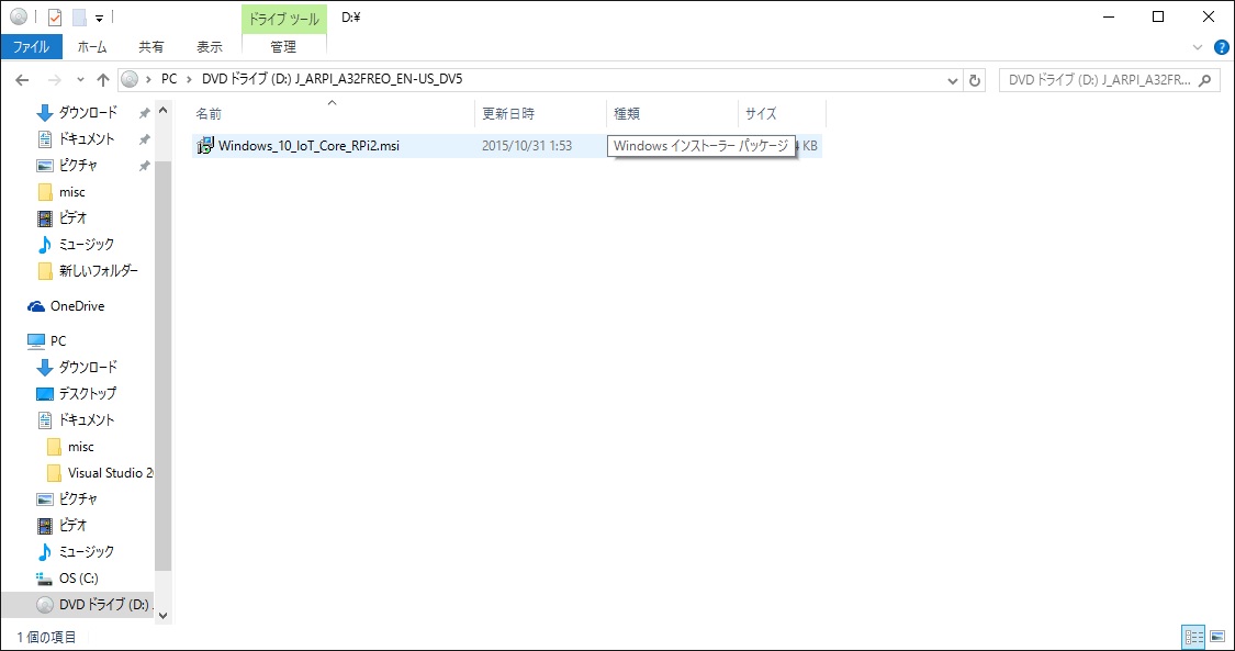 As the iso file is mounted as a DVD drive (D:), please open up the iso file and double click Windows_10_IoT_Core_PRi2.mis to start the install process.