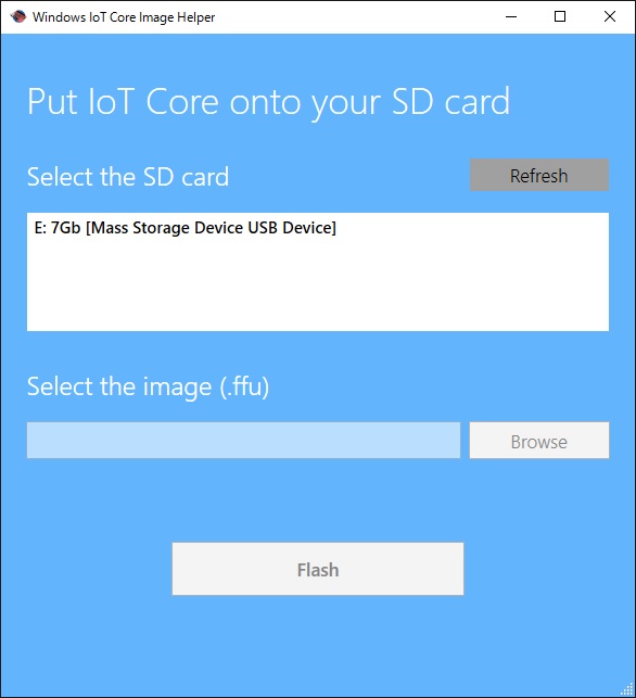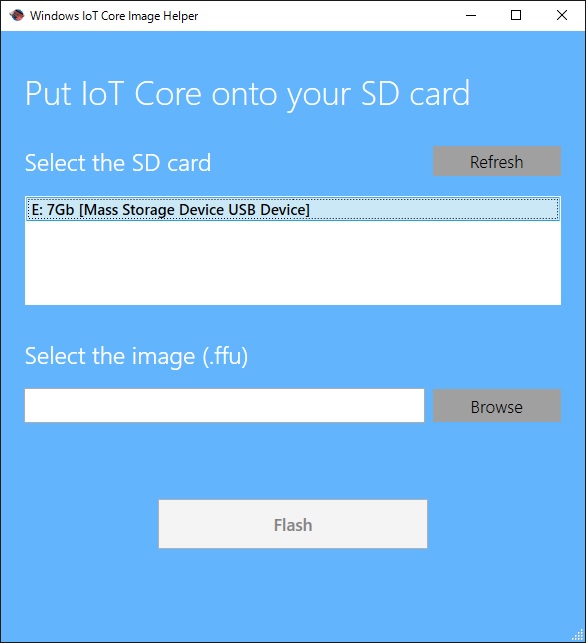 Insert the microSD card, which Windows 10 IoT Core for Raspberry Pi has will be written into, to the microSD card reader. As the microSD card reader is attached to the working PC, start up Windows IoTImageHelper. Then, the window shown below appears on the screen.