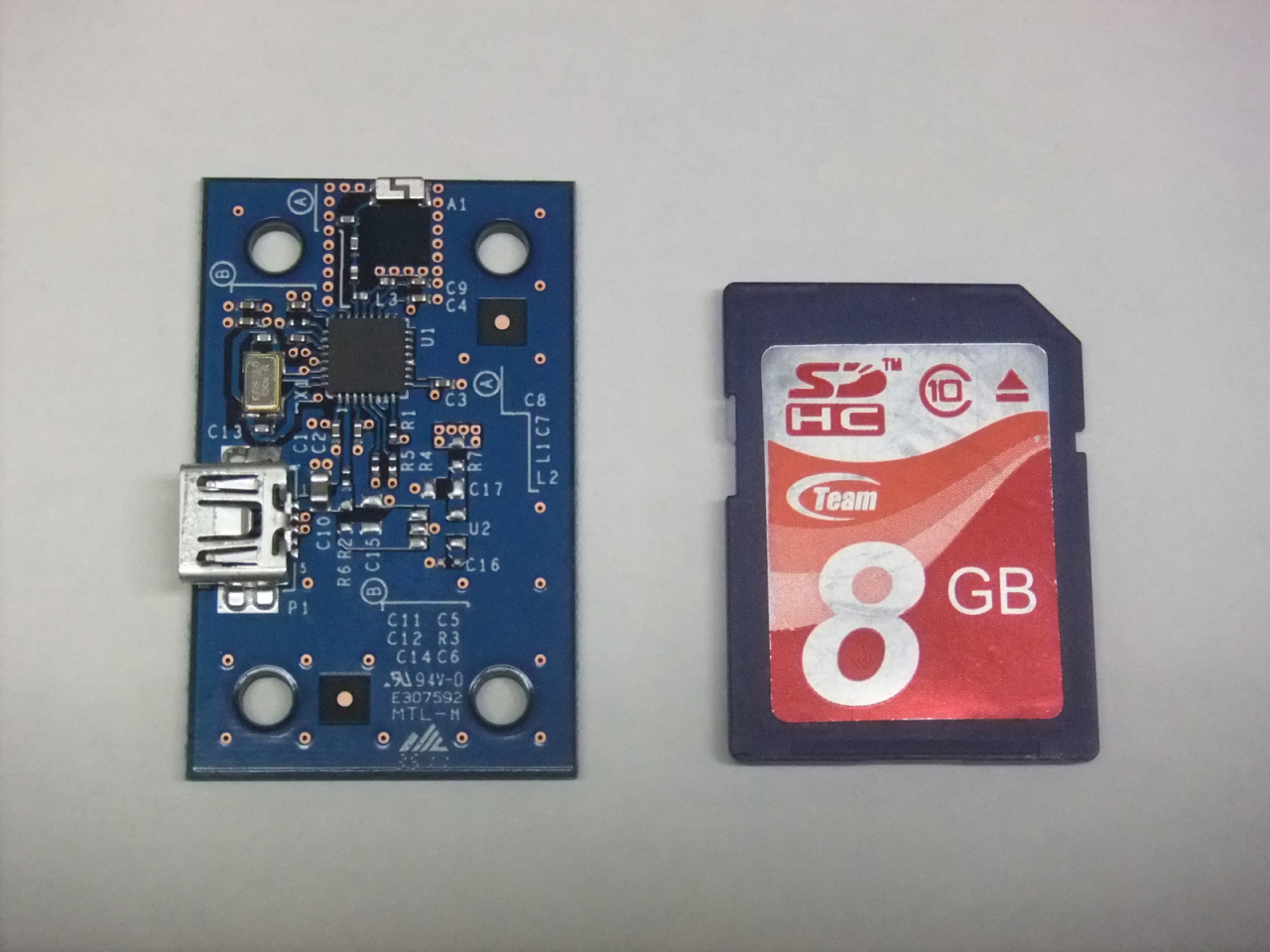 This ANT module board prototype is equipped with mini B of USB connector. This module can communicate with a Windows PC via a UAB cable. It draws its power sources form the USB connector.