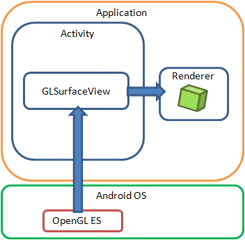 On Android, OpenGL ES can work with both Java and NDK (Android Native Development Toolkit). In this section explains how to use OpenGL ES on Java version of Android. The diagram below shows a basic configuration for applying OpenGL ES to an Android application.