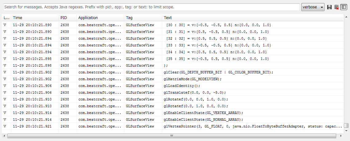 GLSurfaceView.DEBUG_LOG_GL_CALLS: As the commands of OpenGL ES are executed , logs are output to its debugger(LogCat).