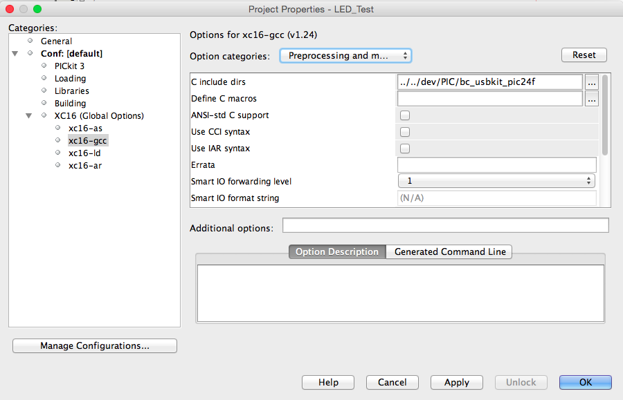 At Option categories, select “Preprocessing and message” and add the path of "bc_usbkit_pic24f" to "C include dirs."