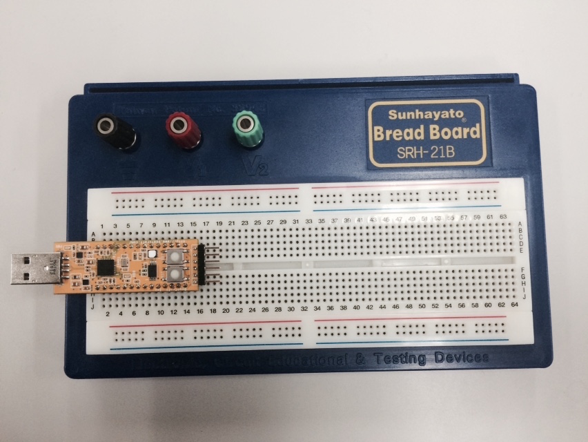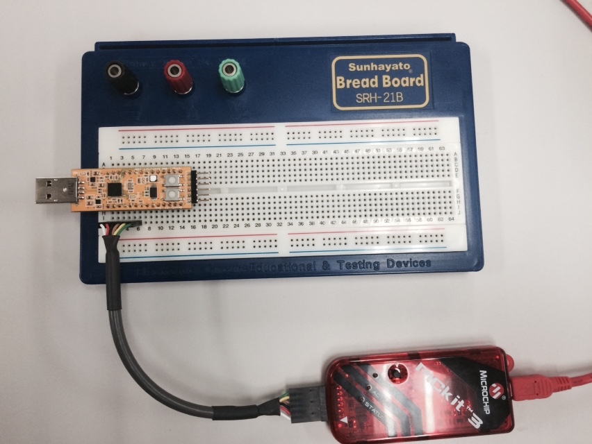 RA0, the 23rd-pin at J1, is used.~ The 14th-pin at J1 is used as GND since the location of the pin is easy to access and to be identifiable.~ Please accordingly set the LED, resistor, and cable in the breadboard as they are shown in the picture below.
