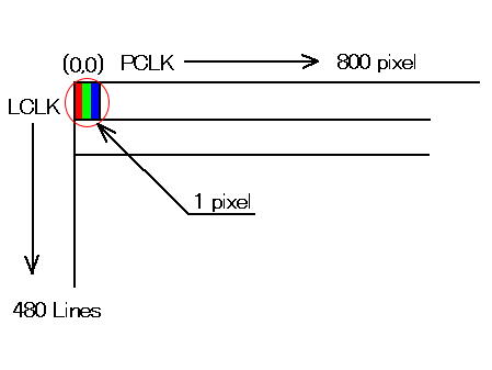 Next, OMAP sends a set of a PCLK signal and the amount of one pixel image data to the 24bit length data bus. As this TFT-LCD receives the PCLK signal, the TFT-LCD reads the 24bit length bus, and displays the information of the data at the (0,0) pixel. As OMAP is setting up the information of the next data at the data bus, OMAP sends a PCLK signal to the TFT-LCD again. As the LCD receives the PCLK signal again, the LCD reads the data from the data bus and displays the information on the next pixel. This process can be repeated 800 times. After repeating this process 800 times, drawing of the first line is completed. After the completion of drawing, OMAP sends an LCLK signal. This signal indicates the ending of drawing a line and the beginning of drawing a next line below the previous line.~ After the LCLK signal is received, the pixel drawing begins from left side and one pixel below the previous drawing. As TFT-LCD receives a PCLK, it reads from the image data from data bus and displays the image. To draw a new line, this process repeated 800 times (again). This PCLK-then-LCLK process is totally repeated 480 times, one frame of an image is completed (this explanation assumes that this is a case of non-interlaced display). After one frame is finished, the FCLK signal is sent, the drawing of the next frame starts at (0,0), and the drawing goes pixel by pixel. To repeat this drawing process, the images can be displayed on the screen.~