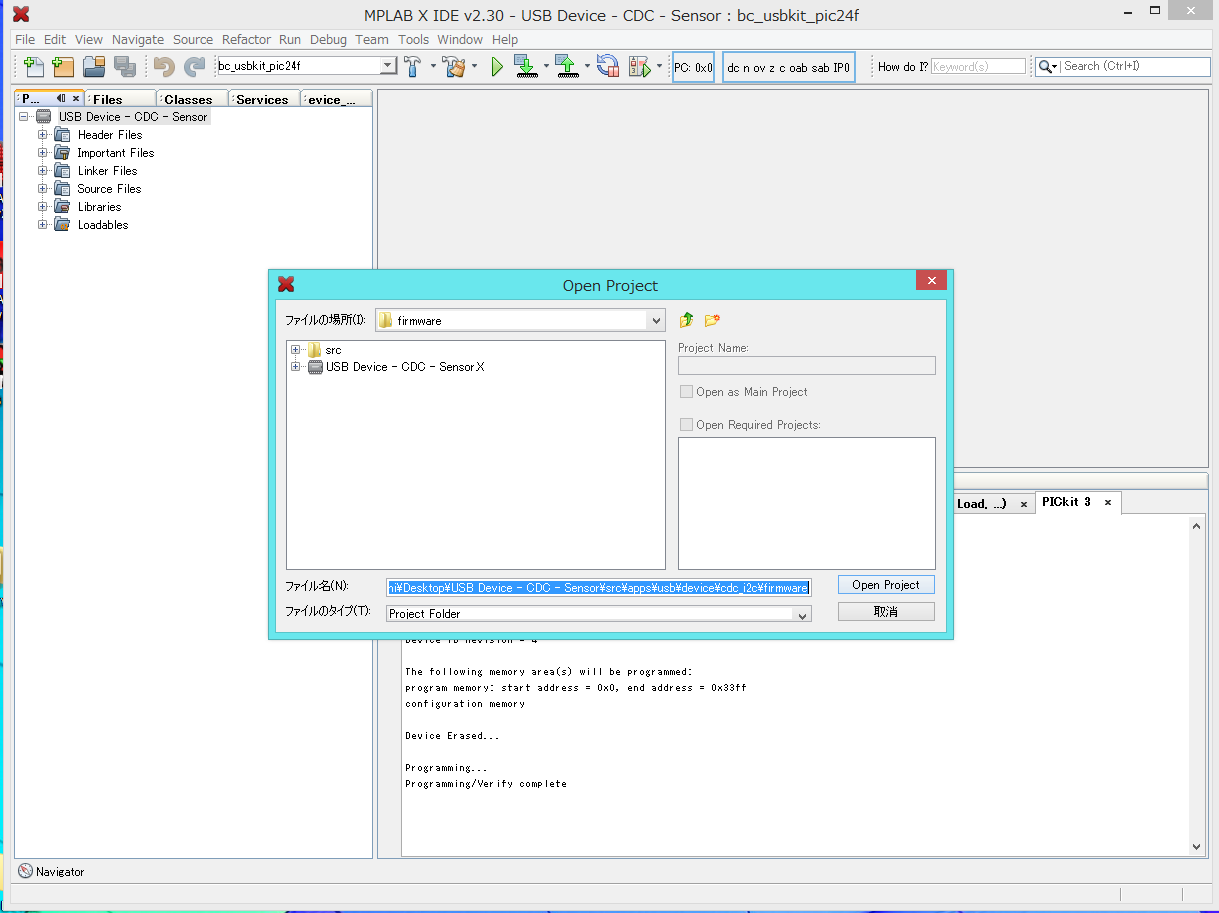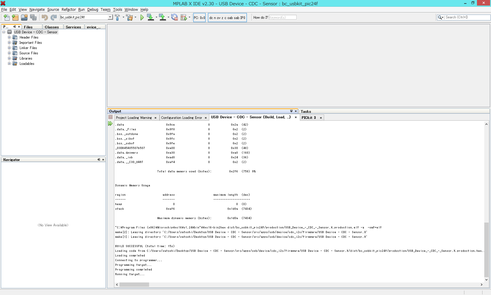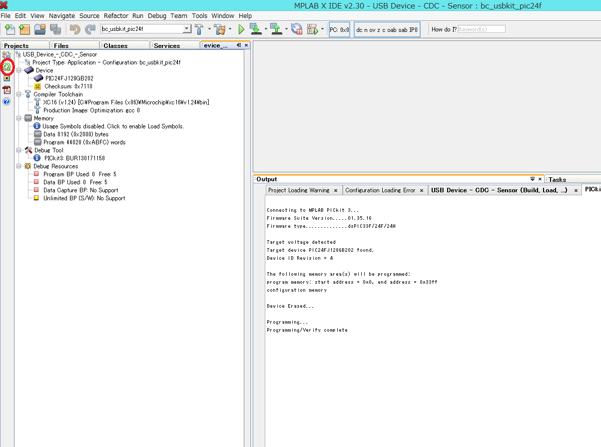 - If the writing process is failed, pull off the USB cable of PICkit 3 from the PC once and reconnect the USB cable to the PC. Then, at MPLAB X IDE, show the tab of “USB_Device_-_CDC_-_Sensor – Dashboard” on the left side pane of the main window, and click the icon of “Refresh Debug Tool Status.”