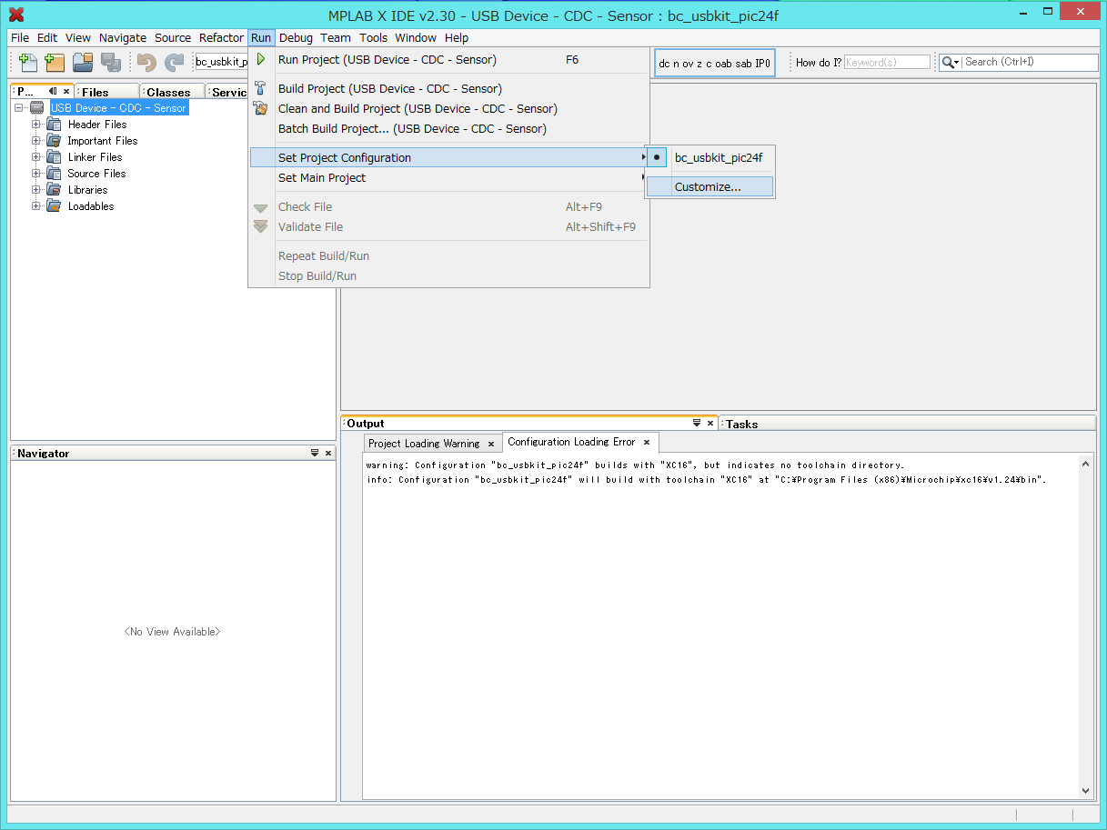 From the menu of MPLAB X IDE, choose Run →Set Project Configuration → Customize.