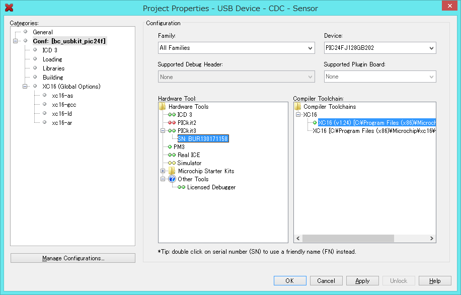 As the Project Properties Window opens, configure Hardware Tool and Compiler Toolchain for the project. In this project, PICkit 3 is selected for Hardware Tool, and XC16 (v.1.24) is chosen for Compiler Toolchain.