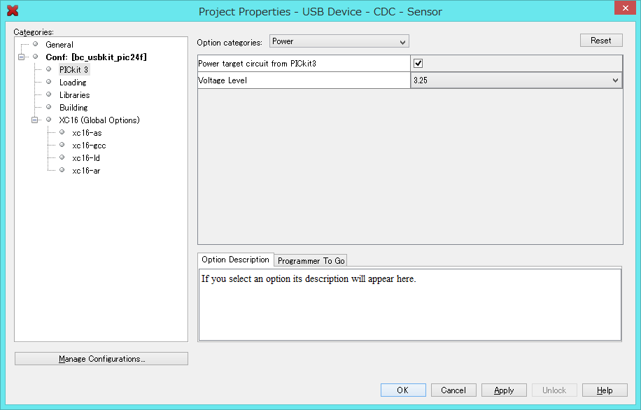 - Once these configurations of Hardware Tool and Compiler Toolchain are completed, select the configuration of Power for PICkit 3. Then, check the box of “Power target circuit form PICkit 3.” This is the end of preparations for building the firmware.