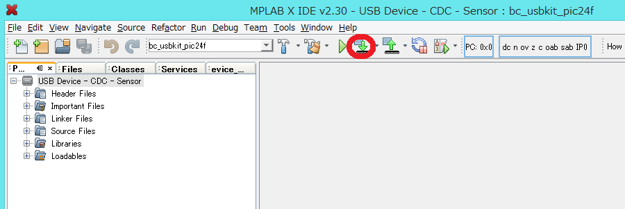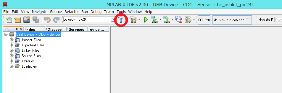- Once the preparations are completed, to click the icon of Build Project (look at the red circle in the picture) on the window menu of MPLAB X IDE, execute the build process.