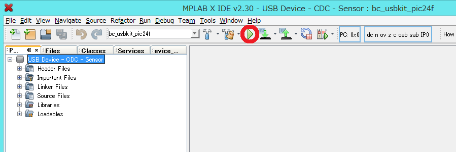 - The build process of the firmware is completed, click the icon of Run project (See the red circle in the picture) on the window menu of MPLAB X IDE.