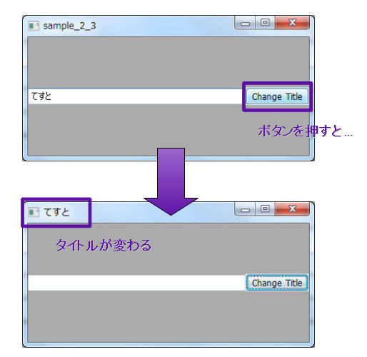 Let's see how events are processed as controls are used. At the sample application of sample_2_3, as inputting text in the text Control and pushing the button, the window title is changed to the text, which has written in the text Control.