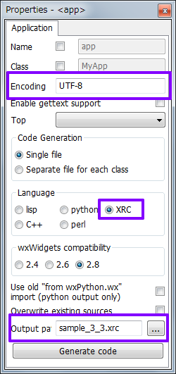 The window title and other specific configurations are remained in the source code side. The GUI location data is output in XRC format. Go to menu of Main window, select “Generate Code,” and output an XRC file. The location of the output file is set at the properties.