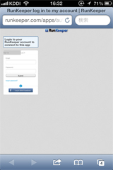 - As you touch Connect to RunKeeper, a browser application starts and the log-in screen of RunKeeper appears. At the log-screen, please inputs e-mail address and password for your RunKeeper account. Then, touch Submit button. If you wish to log in with Facebook, please touch Log in With Facebook.