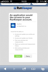 To let BeatRun access to RunKeeper, You may share the workout data with your friends. Also, you may enjoy other features of RunKeeper as you use BeatRun.