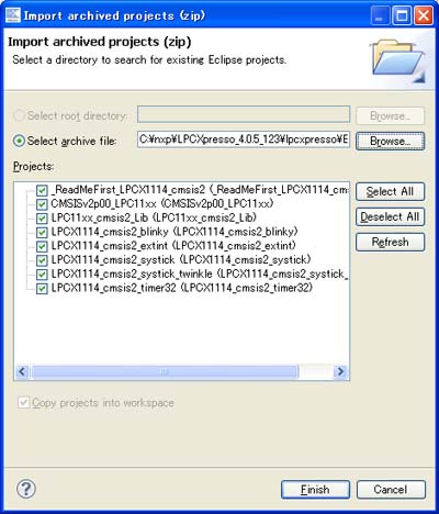 Import archived projects(zip)を選択しLPCXpresso1114_cmsis2.zipを選択すると以下のような画面になるので「OK」を押します。