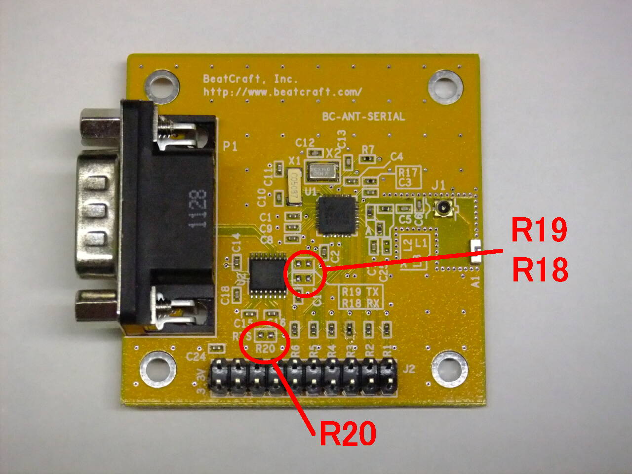 RS-232Cインターフェイスを利用する場合は、下図に示す、ボード上の R18, R19, R20 の各パターンに 1608サイズのジャンパ抵抗を実装します。