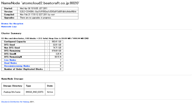 CDH3beta4に含まれるhadoop-0.20.2を使用しています。またhadoop.apache.orgで公開されているHadoopの最新版は0.21.0です。0.20.xと0.21.xでは機能やAPIなどに変更があります。詳細についてはrelease 0.21.0 available をご覧ください。