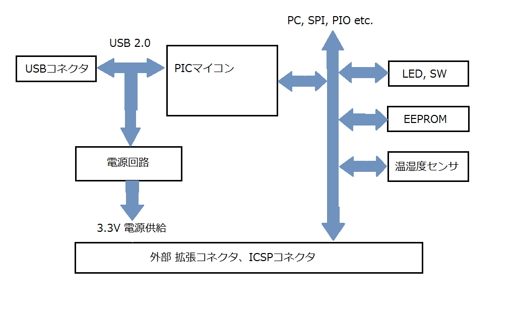 No 名称 Ref 備考 1 ICSP接続端子 J2 ICD3、PICKit3などと接続するための端子 2 リセットボタン SW1 PICをリセットするためのスイッチ 3 ユーザボタン SW2 ユーザプログラムでアクセス可能なスイッチ 4 ユーザLED D1 ユーザプログラムでアクセス可能なLED 5 拡張端子 J1 外部デバイスを接続し、拡張するための端子 基板の両側にある端子列2つで1組になります 6 USBTypeA コネクタ(オス) P1 PCのUSBポートなどに接続するための端子 7 電源表示LED D2 電源が供給されていると発行するLED (ユーザアクセス不可) 8 PICマイコン U1 PIC24FJ128GB202 マイコン本体です 9 EEPROM U2 I2Cでアクセス可能な1Mbits EEPROM 10 湿温度センサ U3 I2Cでアクセス可能な温度および湿度センサ ※ 電源表示LED (D2) は、USBバスから電源供給されると点灯します