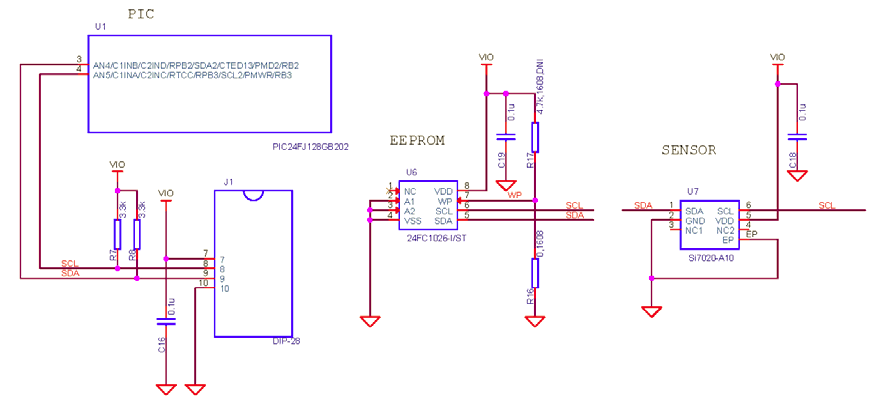 BC-USB-Kit は、オンボードで I2C接続のEEPROMおよび温湿度センサーを搭載し、PIC 内蔵のI2C2 モジュールに接続してあります。
