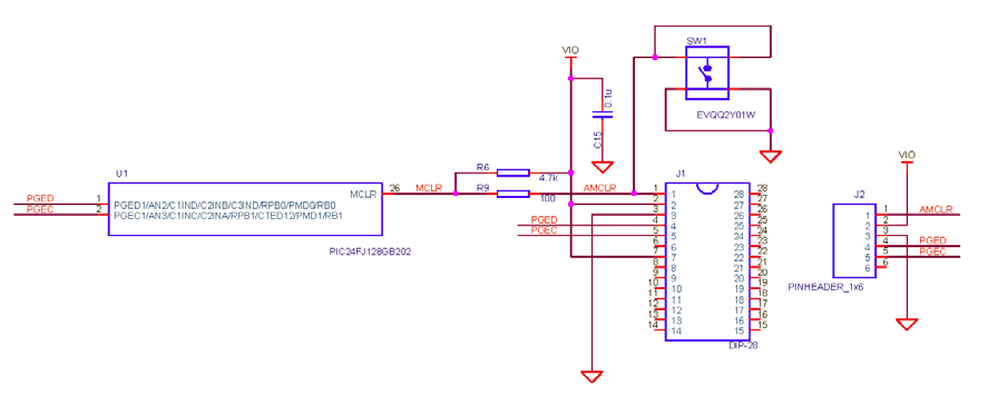 SW1 はリセット端子に接続されています。押下すると、MCLRが L レベルになり、PIC がリセットされます。