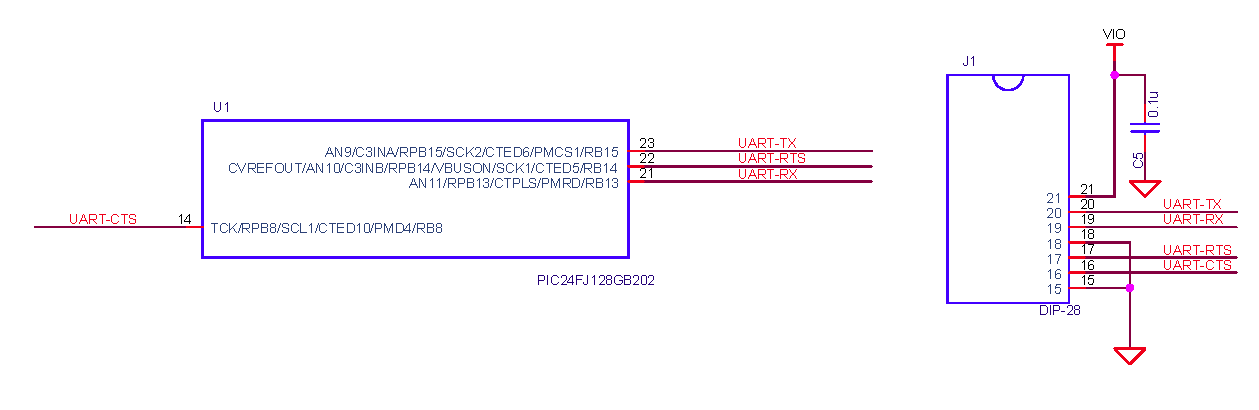 J1 ピン番号 名称 設定レジスタ 設定値 備考 15 GND - GND 16 CTS RPINR18<13:8> 8 17 RTS RPOR7<5:0> 4 18 GND - GND 19 RX RPINR18<5:0> 13 20 TX RPOR7<13:8> 3 21 VIO - 3.3V